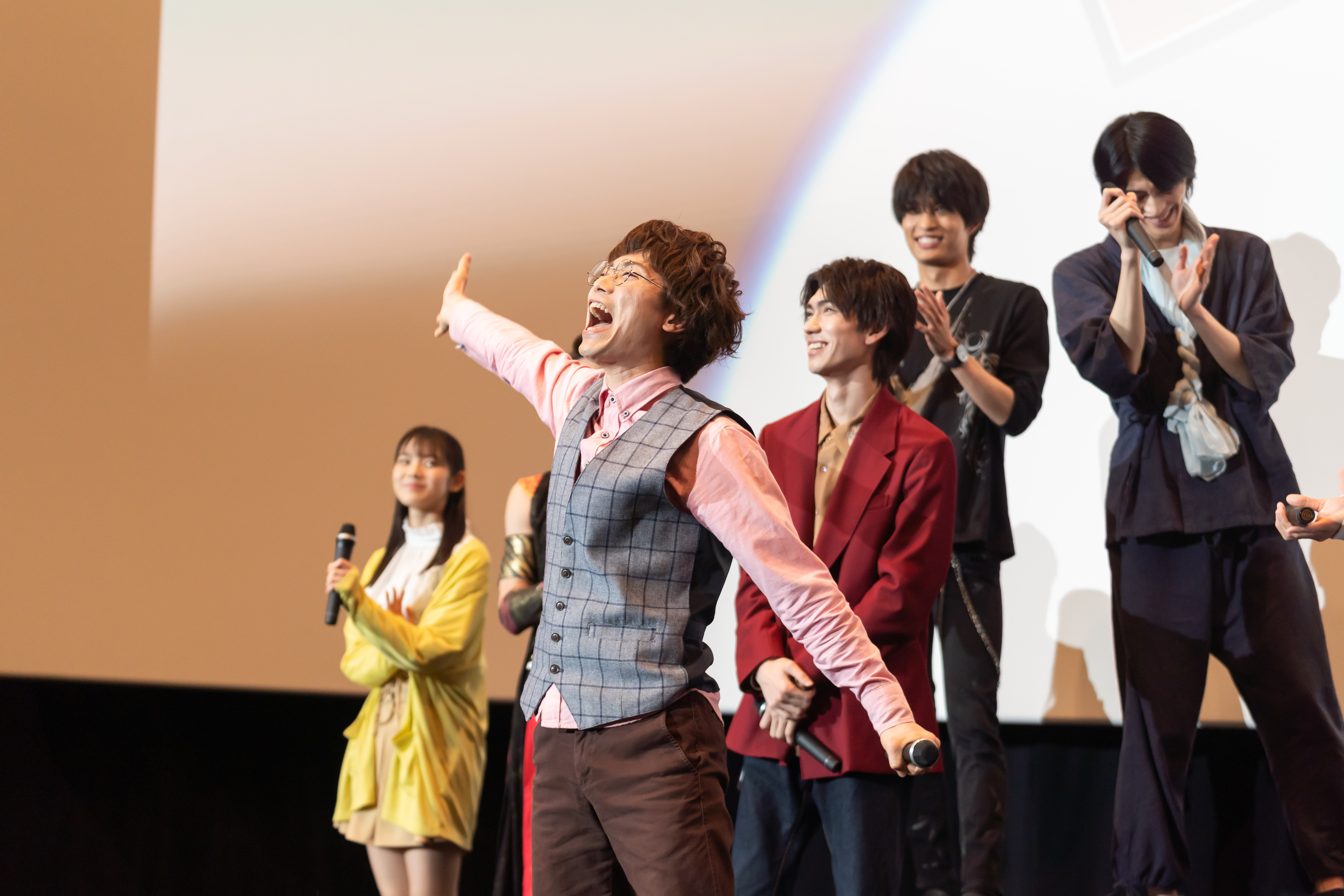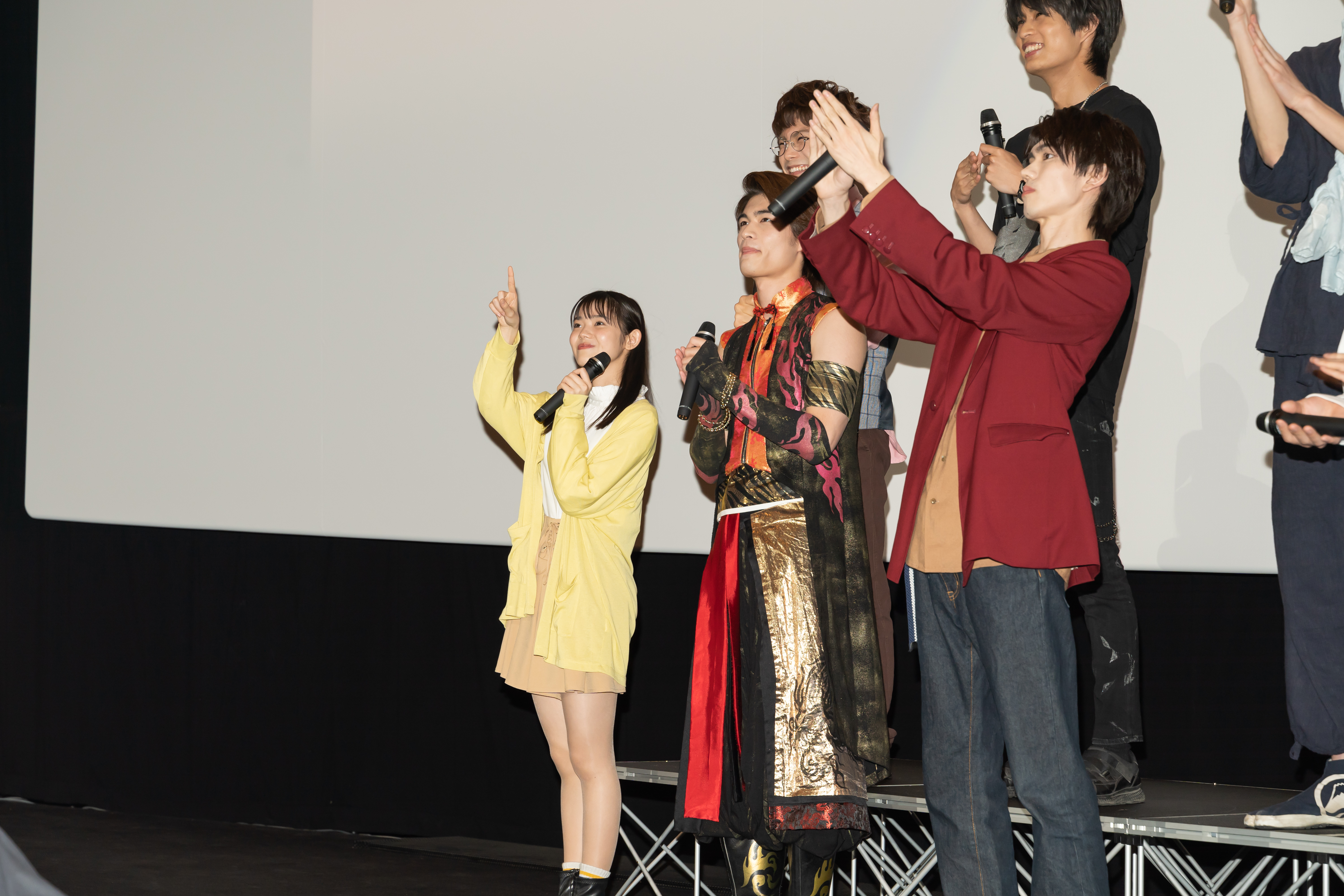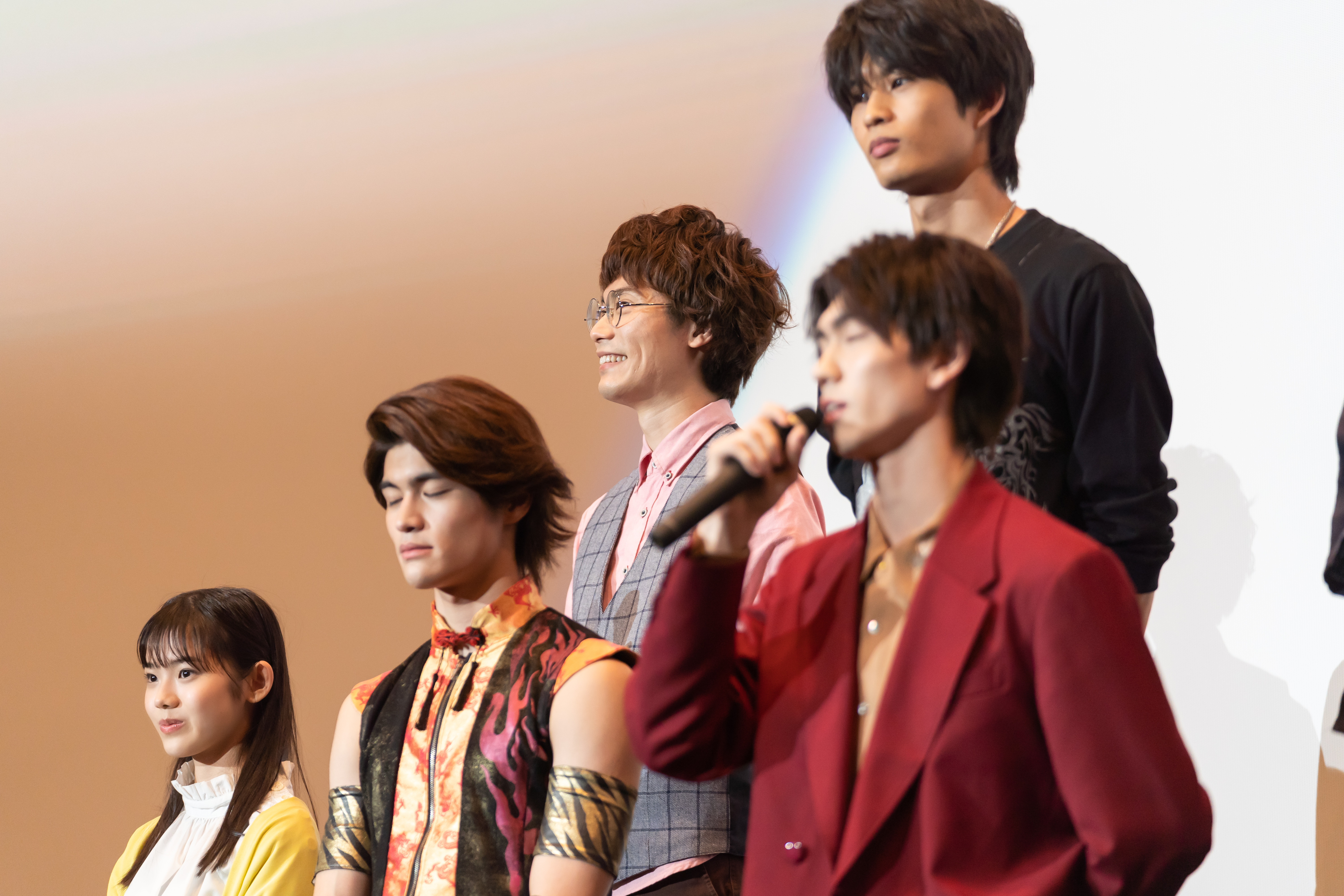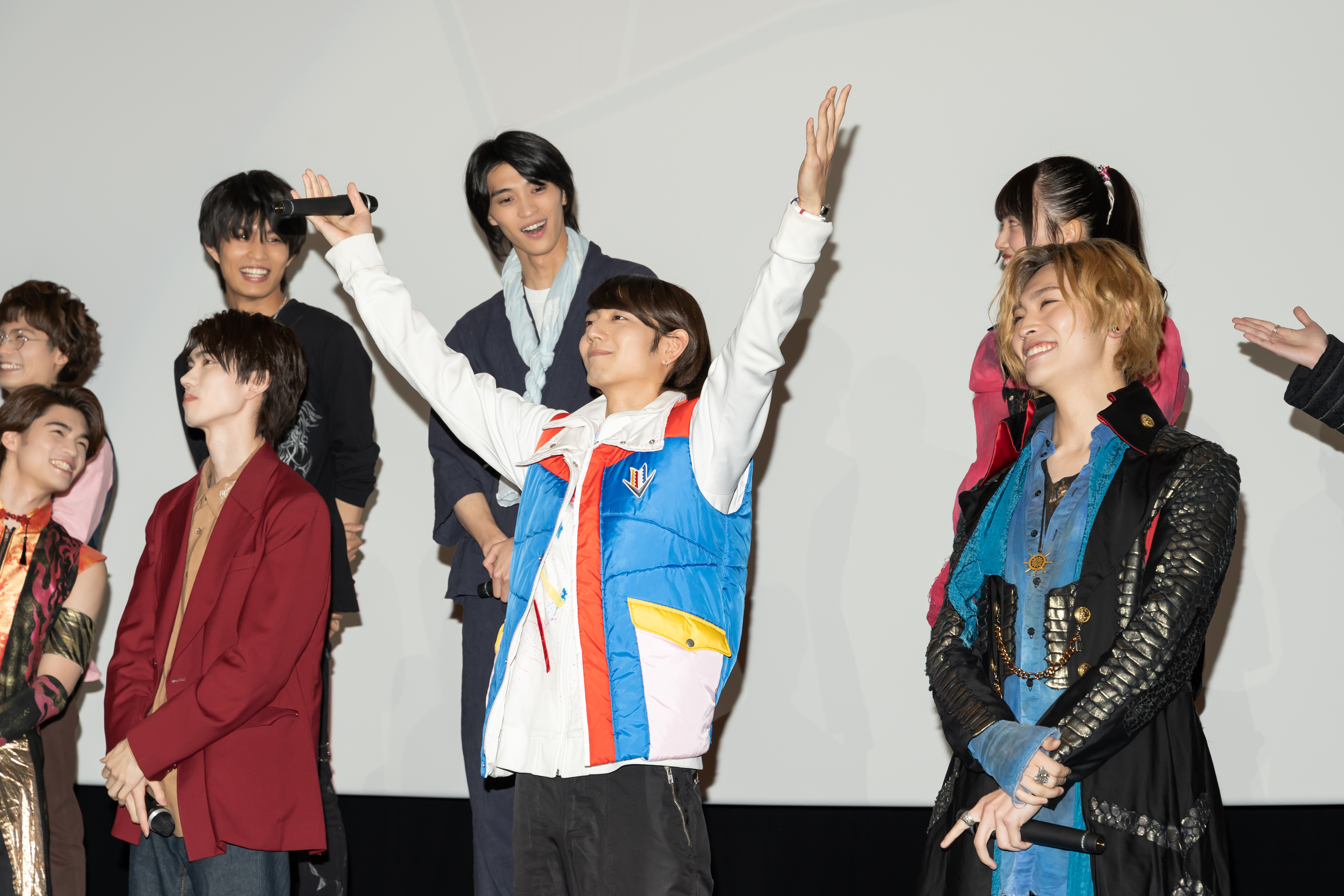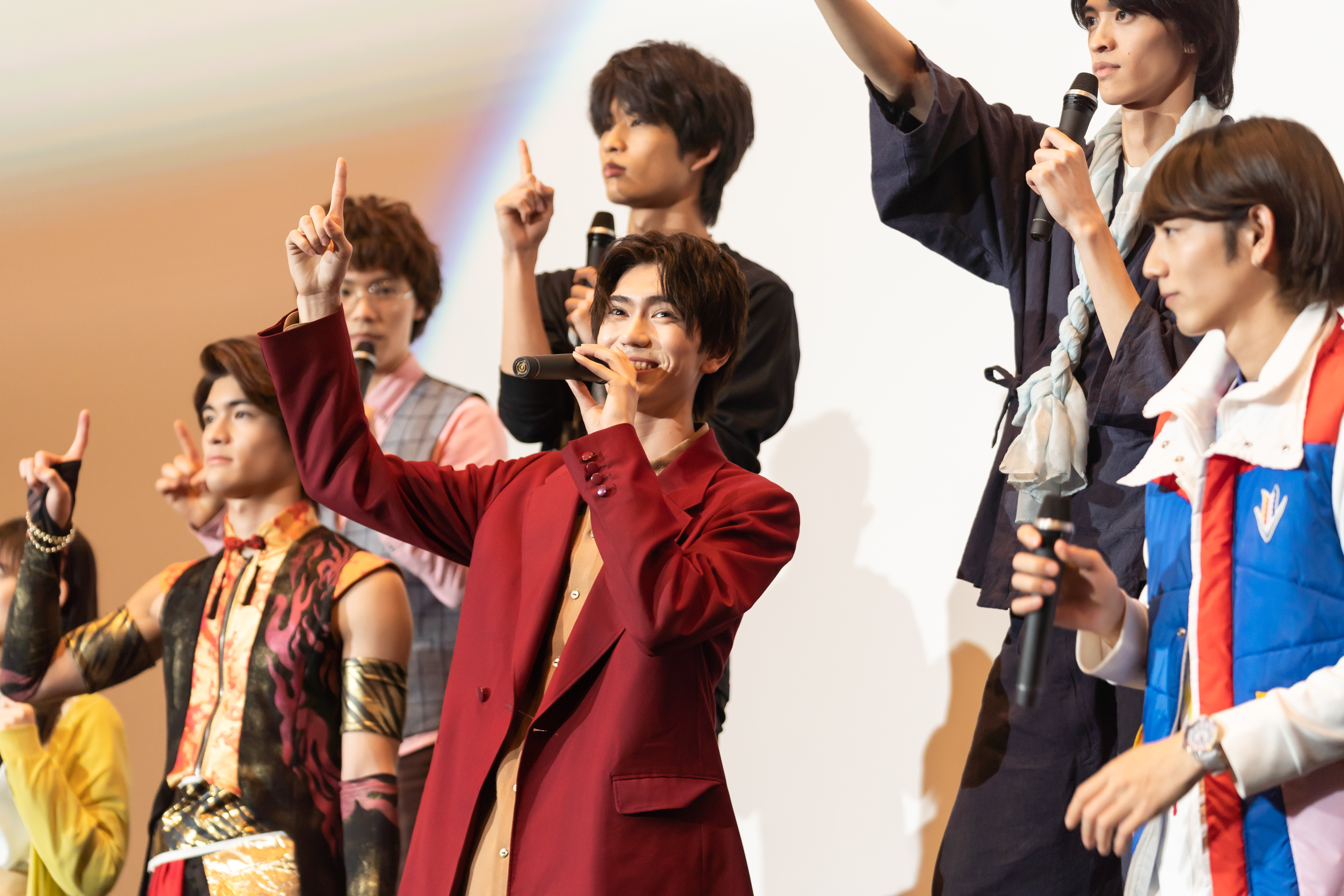 嬉しそうな駒木根葵汰含めたキャスト陣とグッドポーズをする別府由来