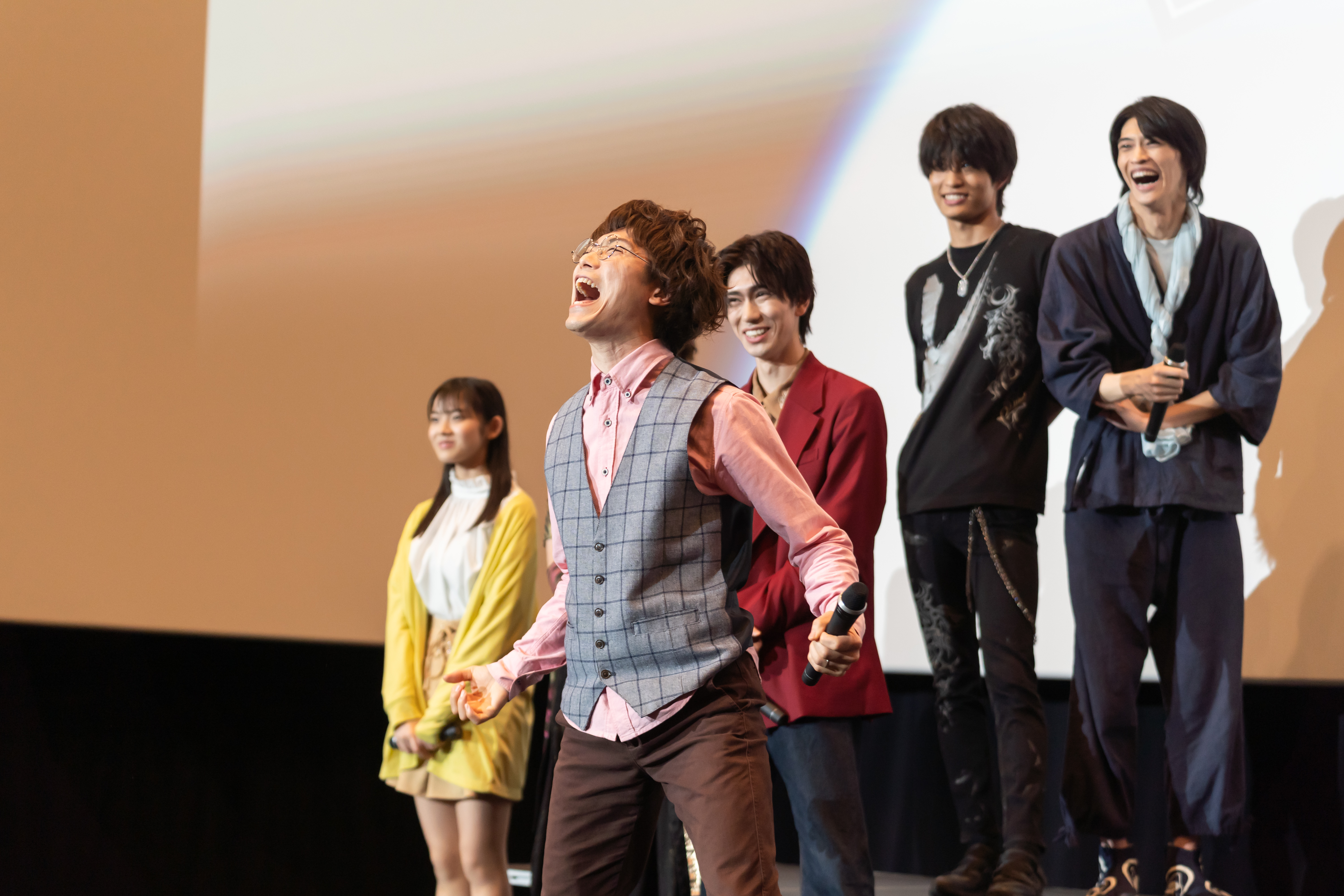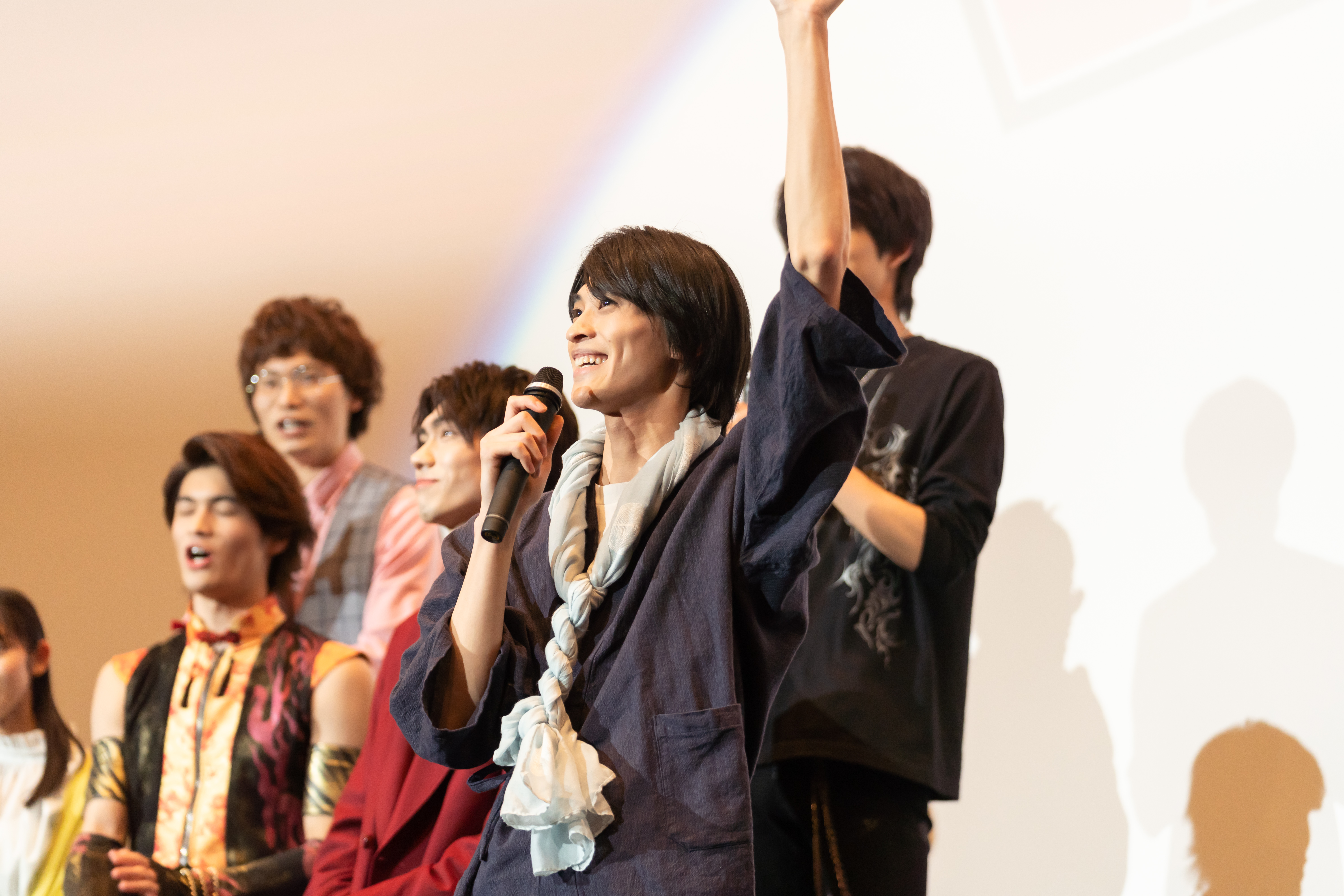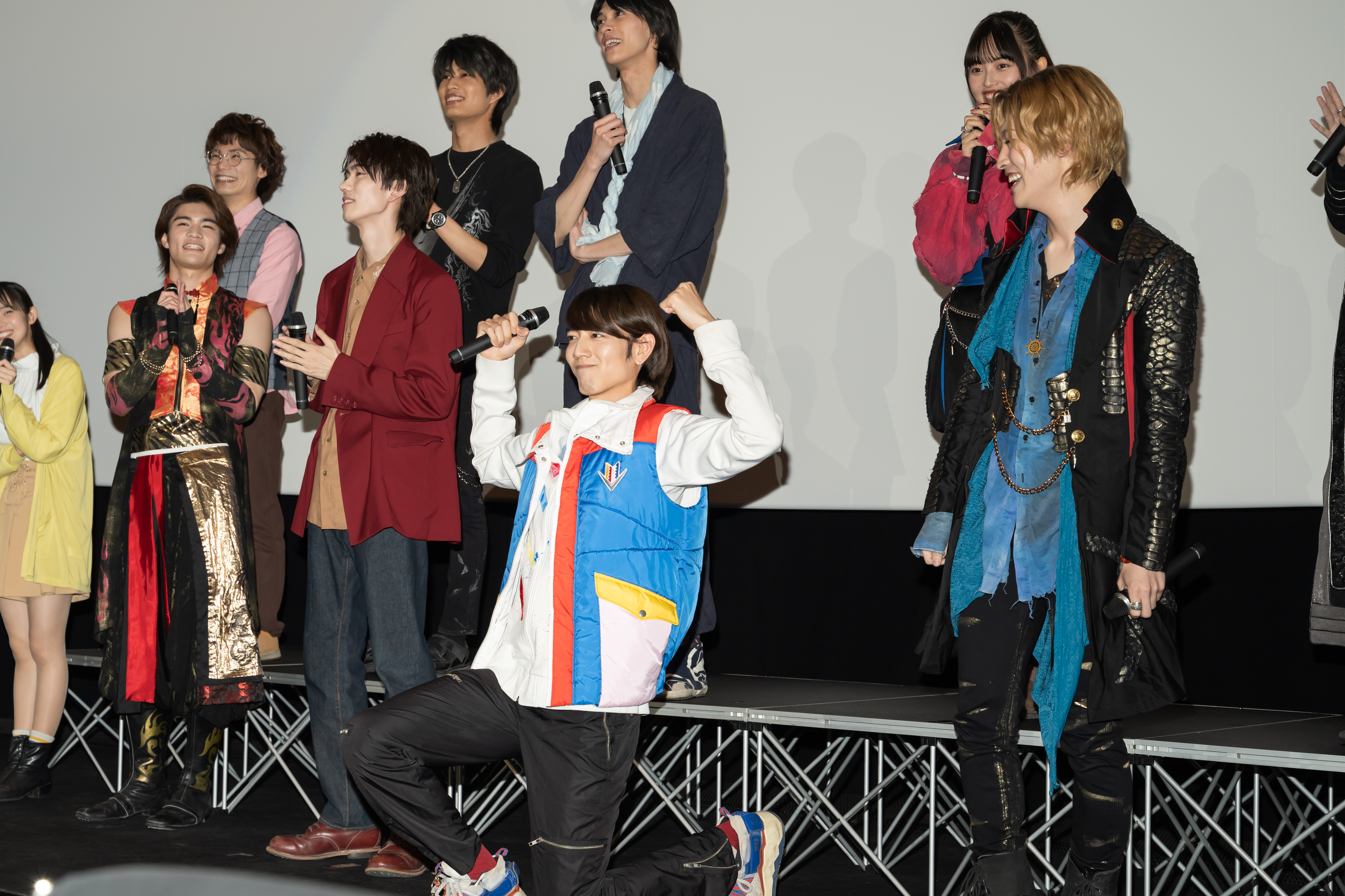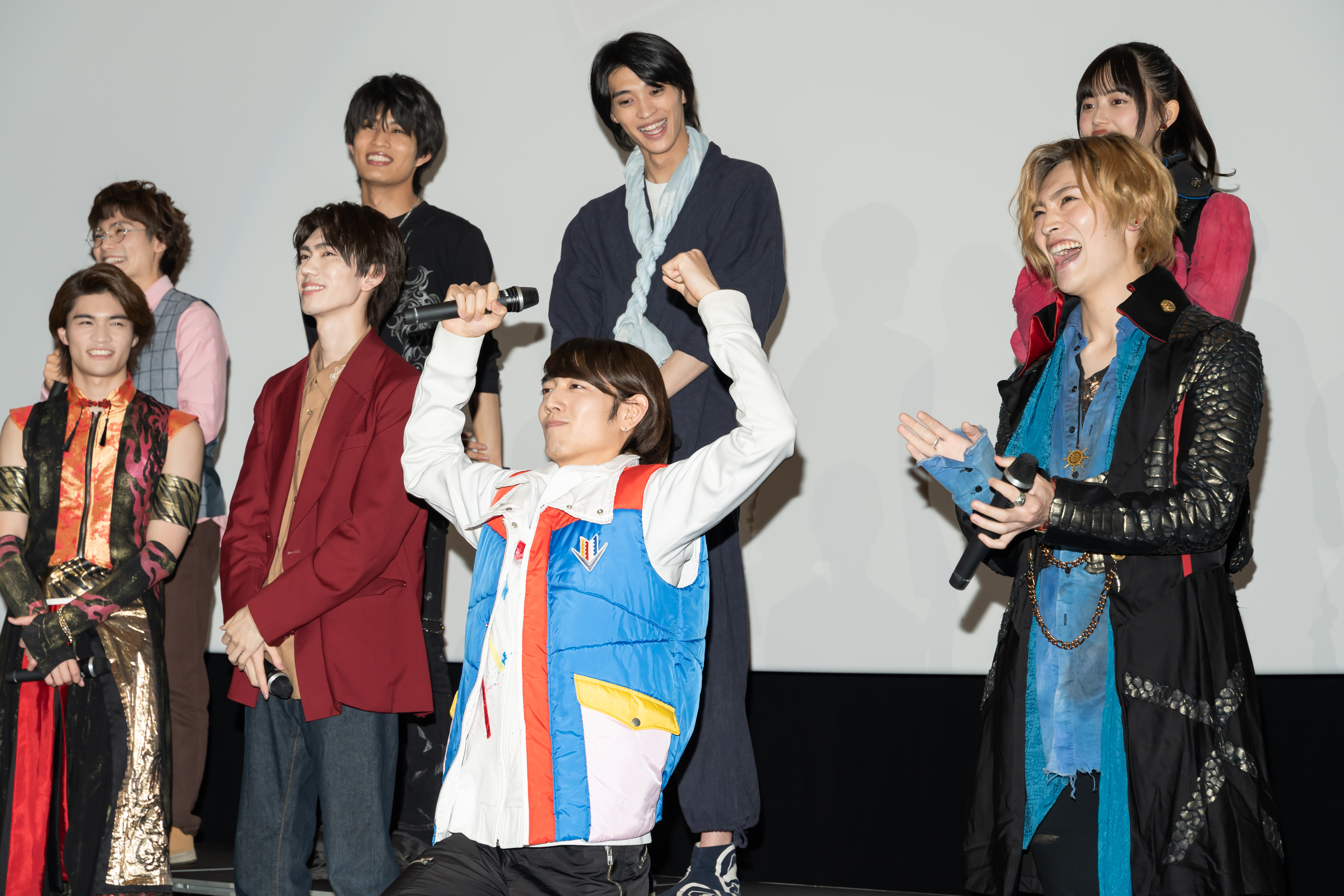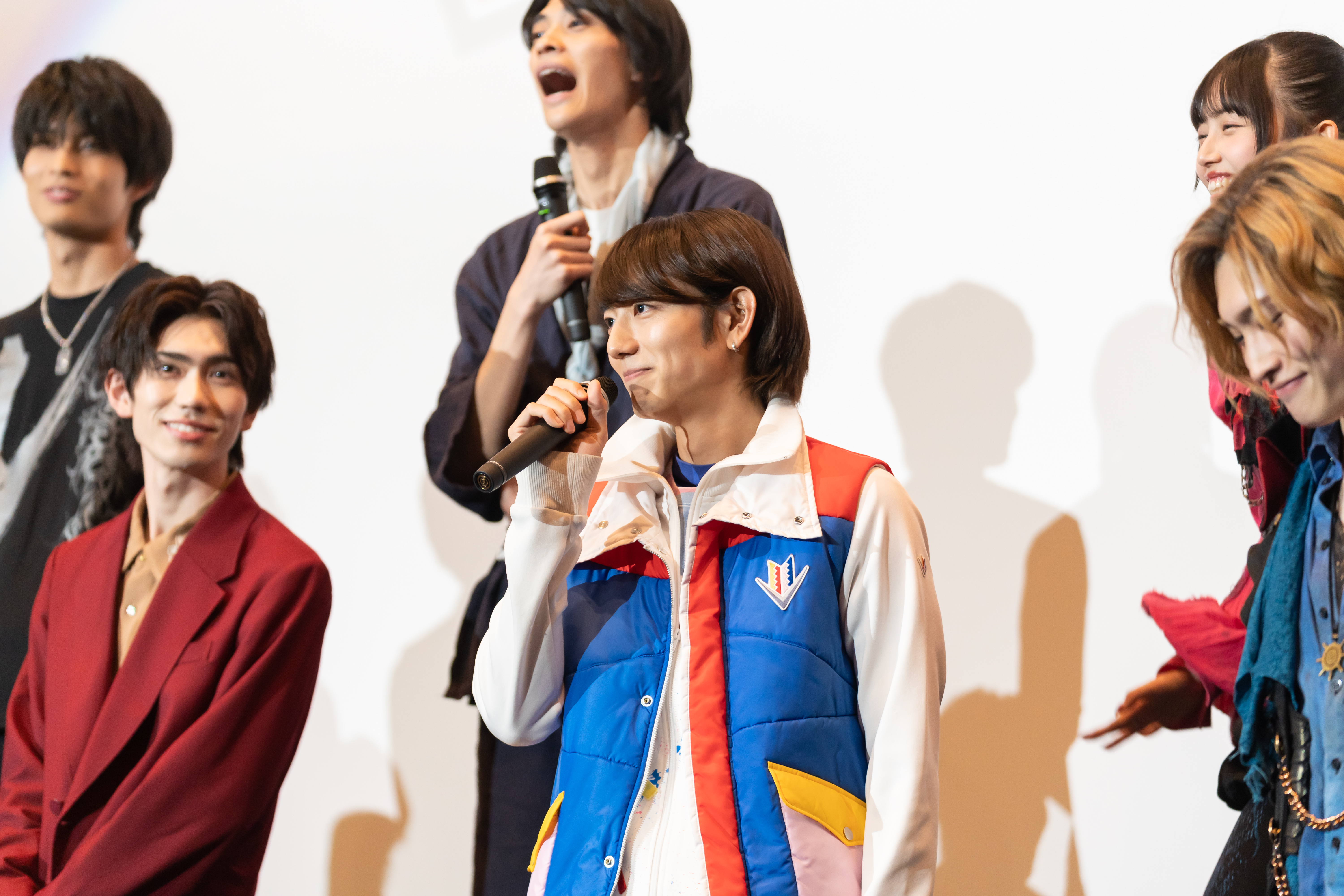 嬉しそうな駒木根葵汰含めたキャスト陣とグッドポーズをする別府由来