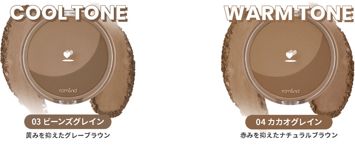 そんなロムアンドから、特徴的な2色のデザインにより“三日月シェーディング”と呼ばれ、韓国でも大ヒットとなった「ベターザンシェイプ」の日本限定色が発売されます。ブラシを回す方向や回数で仕上がりを調節でき、自分好みのシェーディングをお楽しみいただけます。カラーは、イエローベース・ブルーベースそれぞれに合ったCOOL TONEとWARM TONEの2種類をご用意しました。