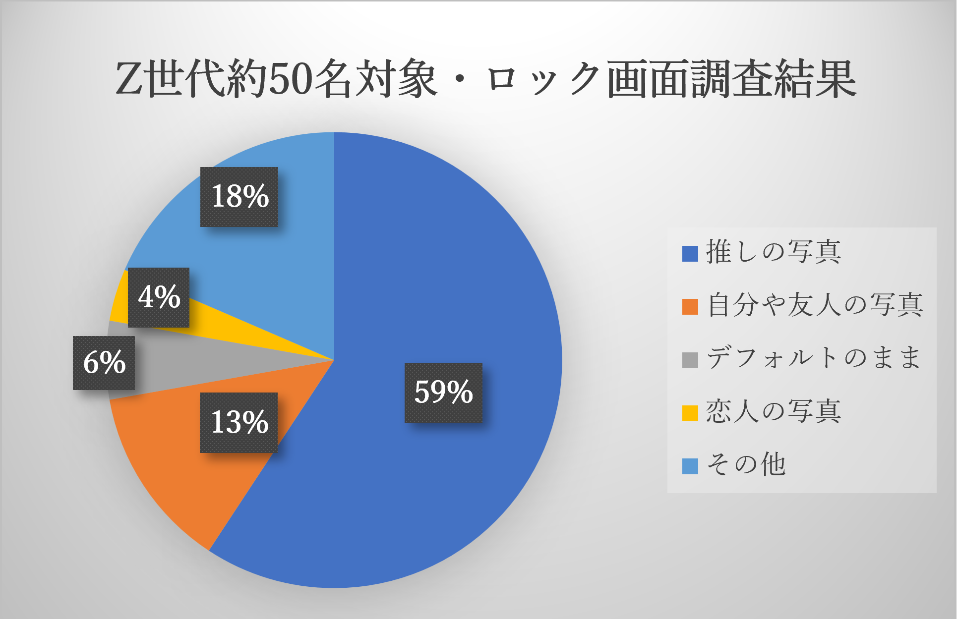 なんと!Z世代の約6割、59%がロック画面の画像を推しの写真にしているということがわかりました。それに続き13%が自分や友人の写真、6%がデフォルトのままという結果になりました。